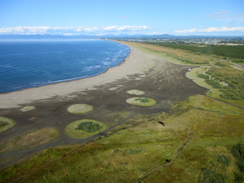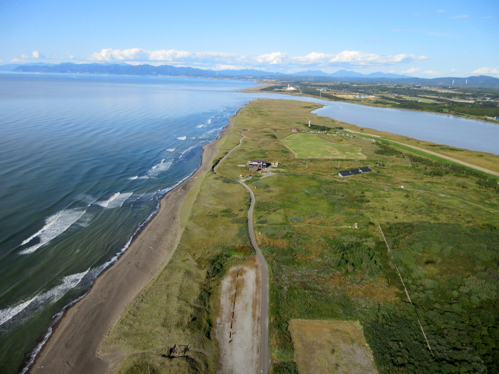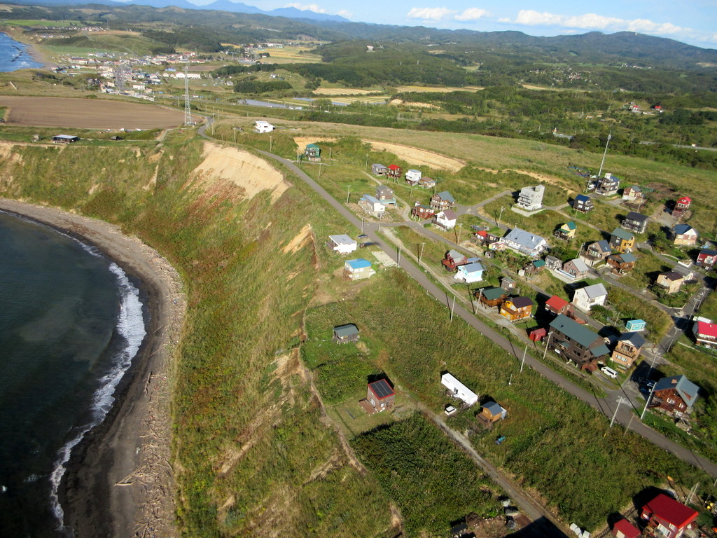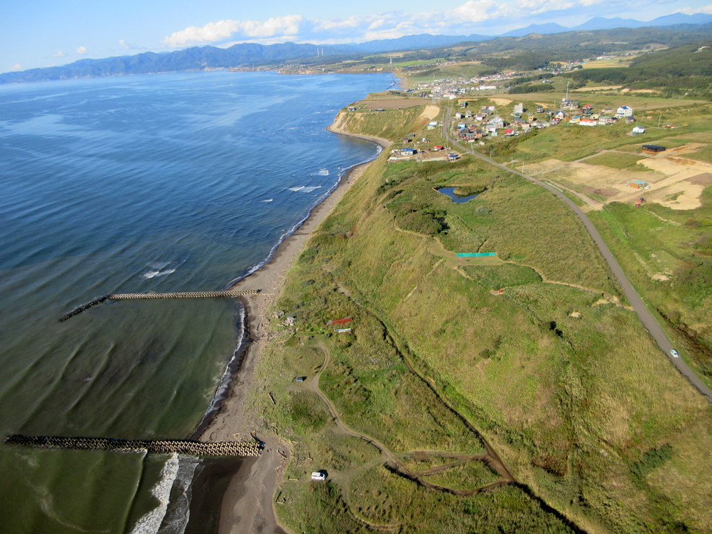 このあたりの浜は、80年前まで油田が有ったところです。ブルーシートが有るところが、望来の僕の生徒が飛んでいる、いわゆる望来エリアです。