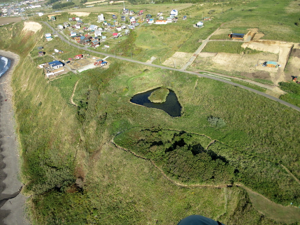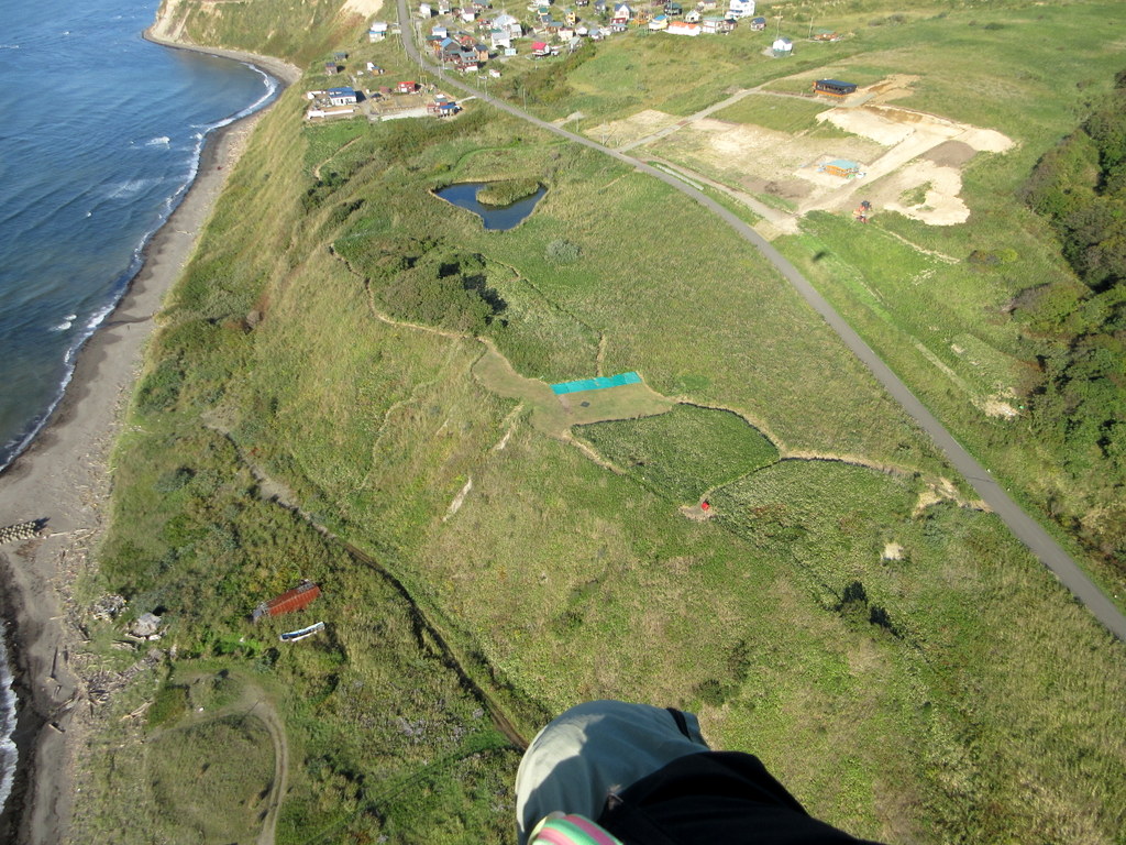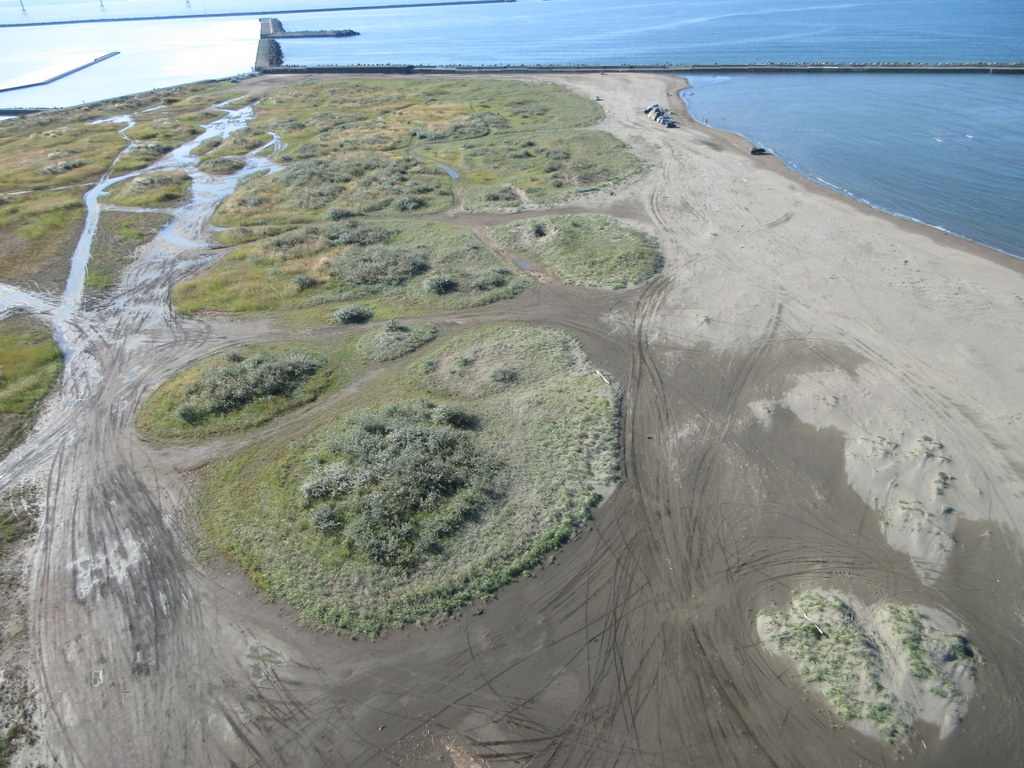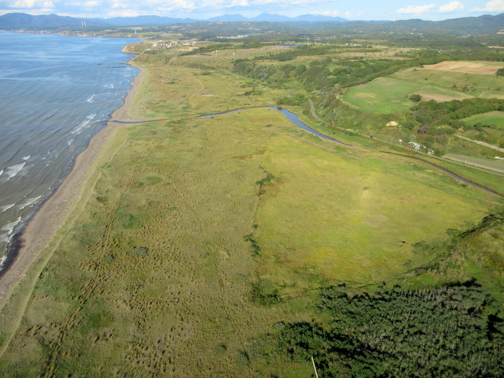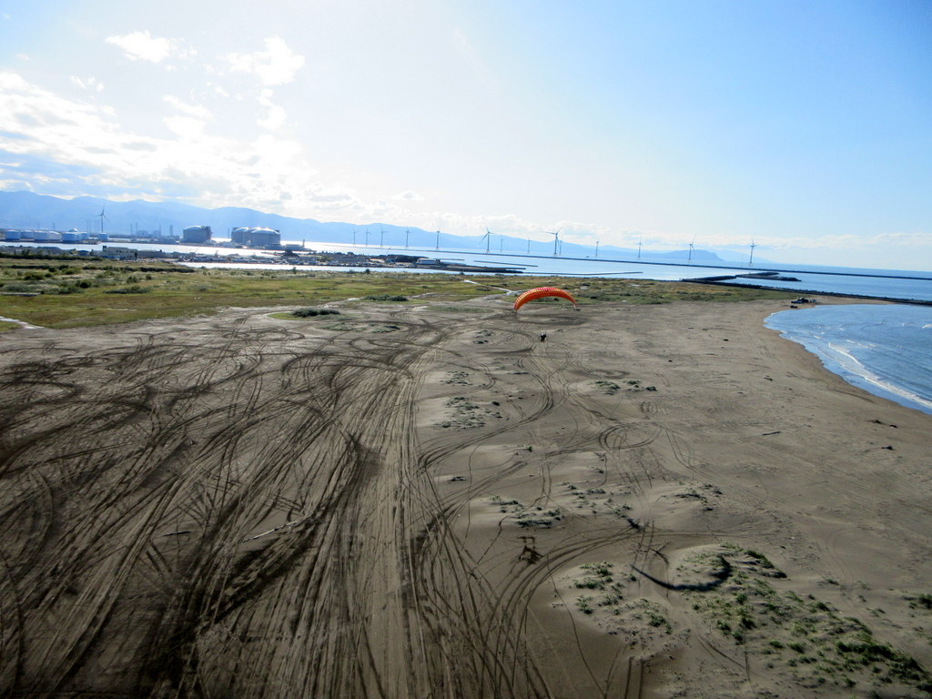 このあたりの浜は、80年前まで油田が有ったところです。ブルーシートが有るところが、望来の僕の生徒が飛んでいる、いわゆる望来エリアです。